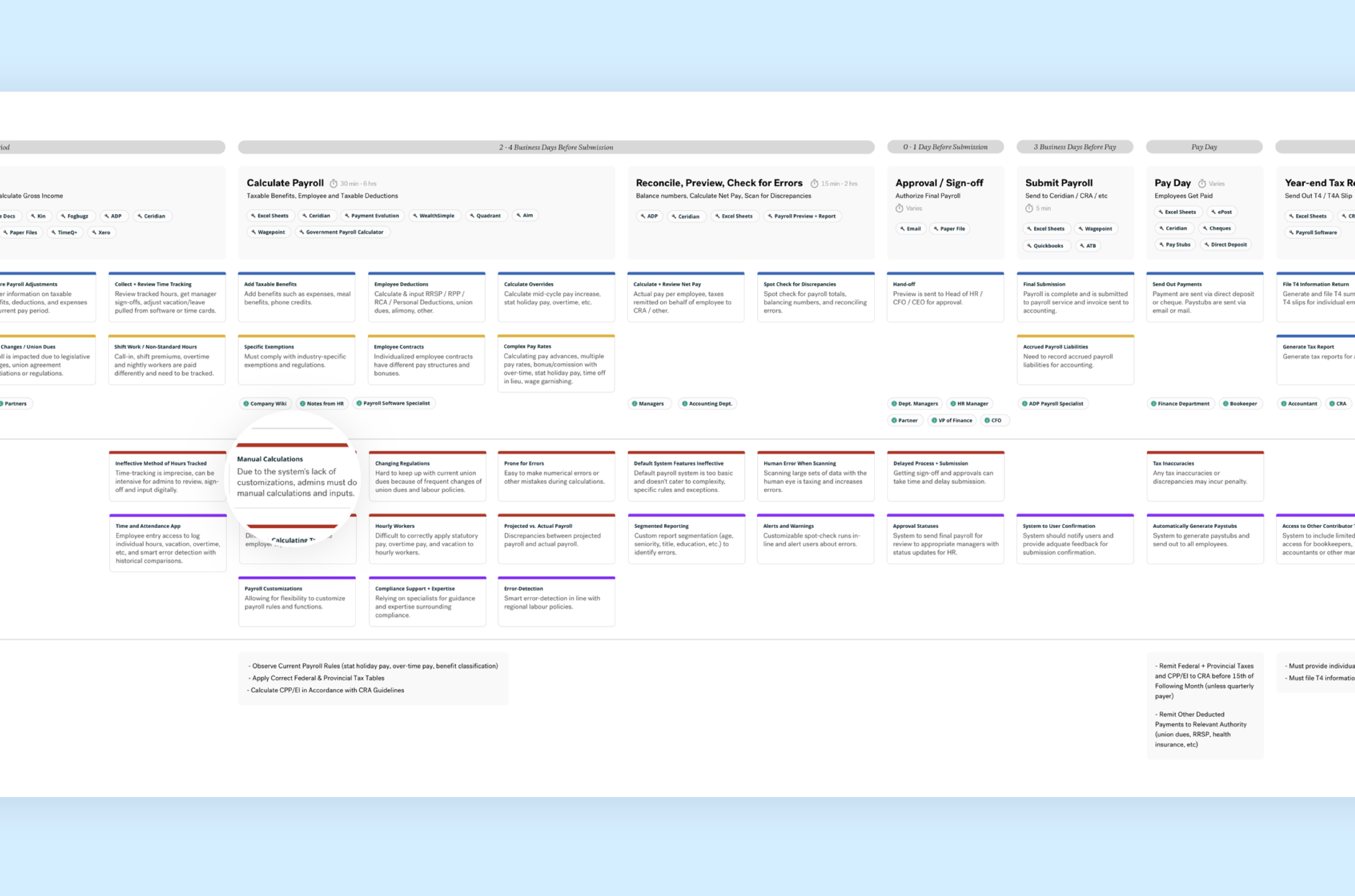 Most HR officers are still using manually built Excel documents or antiquated software to complete complex payroll calculations. These calculations are also prone to errors for special cases (eg. Union dues for part-time staff on vacation pay). In addition, they have to reference federal/provincial regulations, important dates, and tax information outside of their payroll software.
